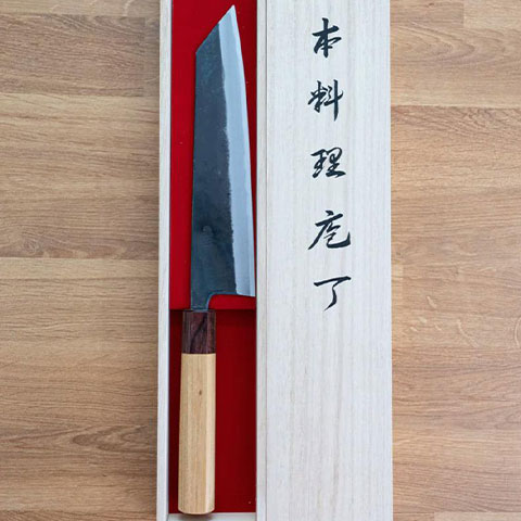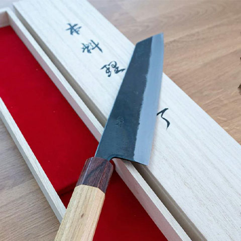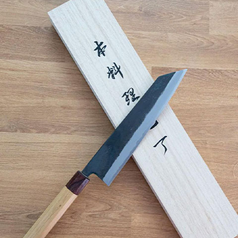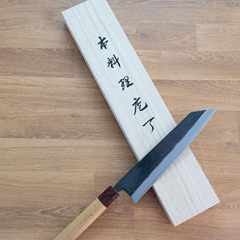 高知縣土佐市最好的刀匠之一,將日立安來青紙1號鋼(日立金屬有【青鋼/青紙】和【白鋼/白紙】兩種材質,從外觀上無法區分。),利用錘子反復敲擊並拉伸來去除雜質,從而打造出一把經過精心火鍛,堅硬,堅韌和鋒利的的黑色刀刃。鋒利度和耐用性與用機器剛剛壓制的工廠產品完全不同。